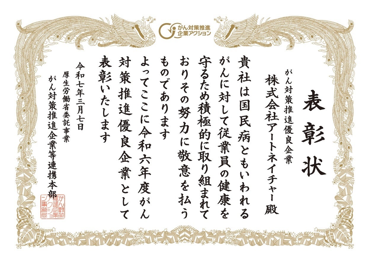 アートネイチャー 、「がん対策推進優良企業」に5年連続で表彰