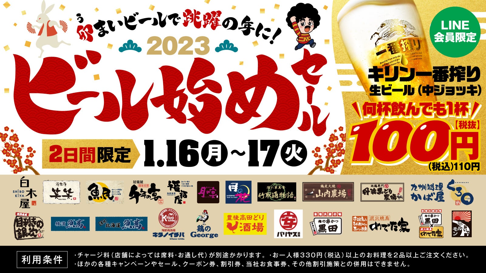株式会社モンテローザ(本社:東京都杉並区、代表取締役:大神輝博)は、2023年1月16日(月)と17日(火)の2日間、“魚民”“目利きの銀次”“白木屋”“笑笑”など全国1231店舗で、「『ビール始めセール』~卯(う)まいビールで跳躍の年に~」を実施いたします。セール期間中は、実施店舗のLINE公式アカウントのお友だち登録をされた会員の皆様には、「キリン一番搾り(生)中ジョッキ」を、何杯注文しても1杯110円(税込)で提供(※1)いたします。この機会にお近くの本セールの実施店舗にご来店ください。