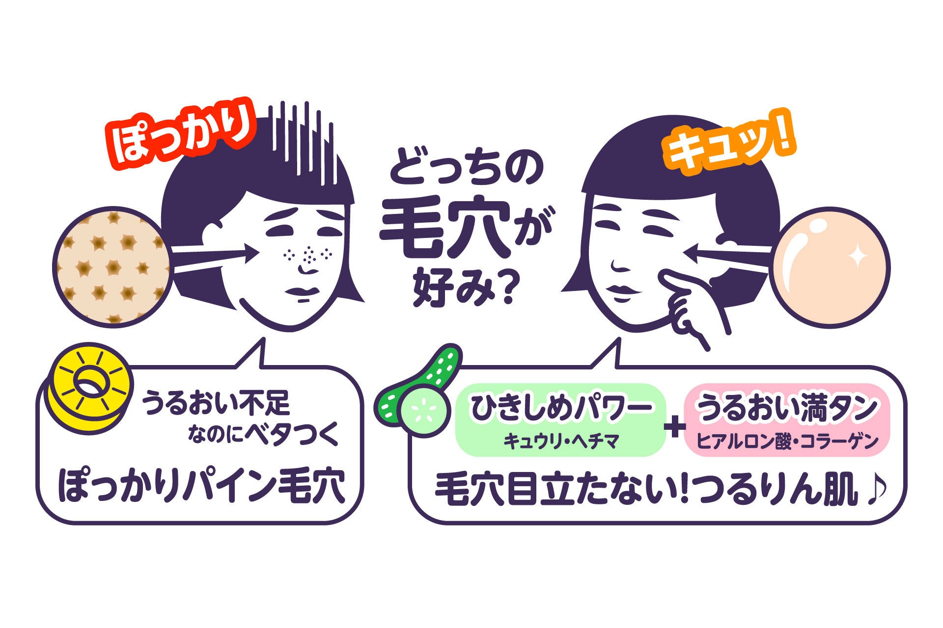 キュウリエキス※1とヘチマエキス※2がベタつきをおさえて毛穴肌をキュッ!さらに保湿成分のヒアルロン酸とコラーゲンでぐんぐんうるおってしっとり。毛穴の目立たないスベスベつるりん肌へ導きます。