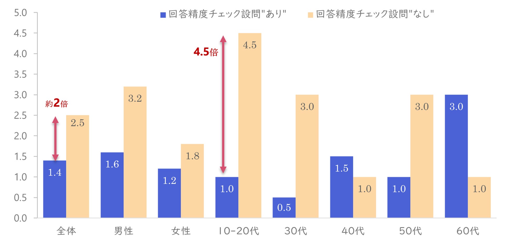 ・年代別では回答精度チェック設問がある場合とない場合で、不正回答者の発生率が最大4倍差がある