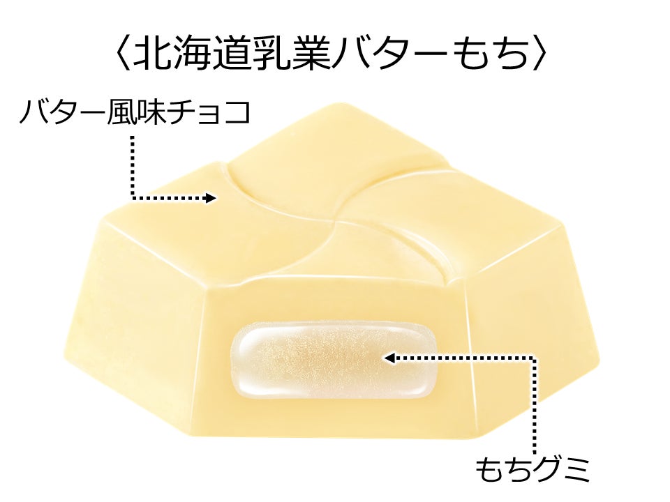 北海道乳業のバターを使用。後味のすっきりとしたバター風味チョコでもちグミを包みました。