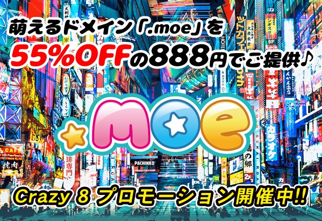 アニメ、マンガ、コスプレ、アイドル、ゲームに萌えるドメイン「.moe」を888円でご提供、誕生8周年記念「Crazy 8プロモーション」開催!