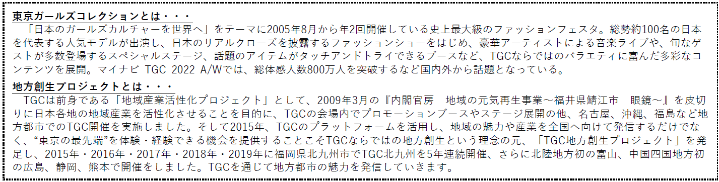 2022年11月1日(火)に発表をした、日本を代表するエンタテインメントカンパニーである株式会社W TOKYOと株式会社LDH JAPANがパートナーシップを組み、全国各地で開催されるTGCの場を活用して、ダンスをはじめとするエンタテインメントと自治体とのコラボレーションを通じた、地域社会への貢献、SDGsの推進(主にSDGs目標3、4、17)を目指す新たなプロジェクトの一環として実現した今回のスペシャルコラボレーション。