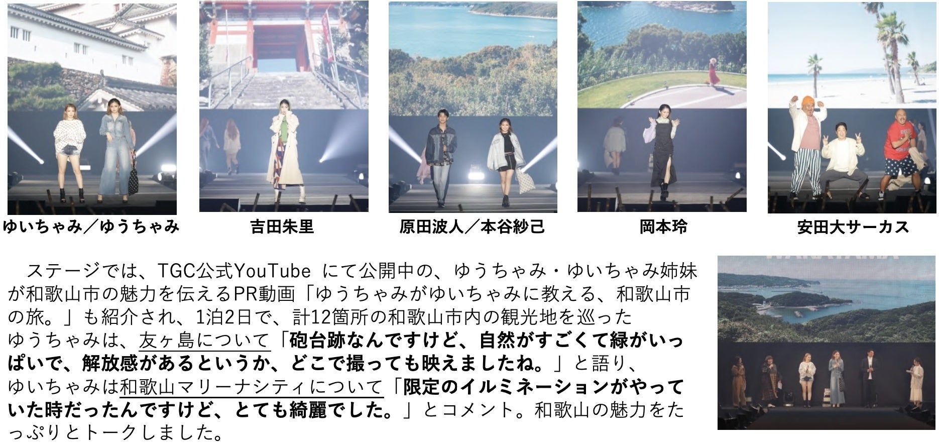 TGC 和歌山 2023の開催地・和歌山市のステージでは、日本を代表するファッション集団「MARK STYLER株式会社」が運営する公式通販サイト「RUNWAY channel」とコラボレーションし、和歌山市の観光地に着ていきたくなるようなコーディネートを提案。また、ゆうちゃみ・ゆいちゃみ姉妹、吉田朱里、和歌山出身の本谷紗己、岡本玲が着用するコーディネートの一部には、糸の染色から織りまでを通して和歌山ニットを生産している「吉田染工」の協力により作製された、オリジナルの和歌山ニットアイテムを取り入れました。