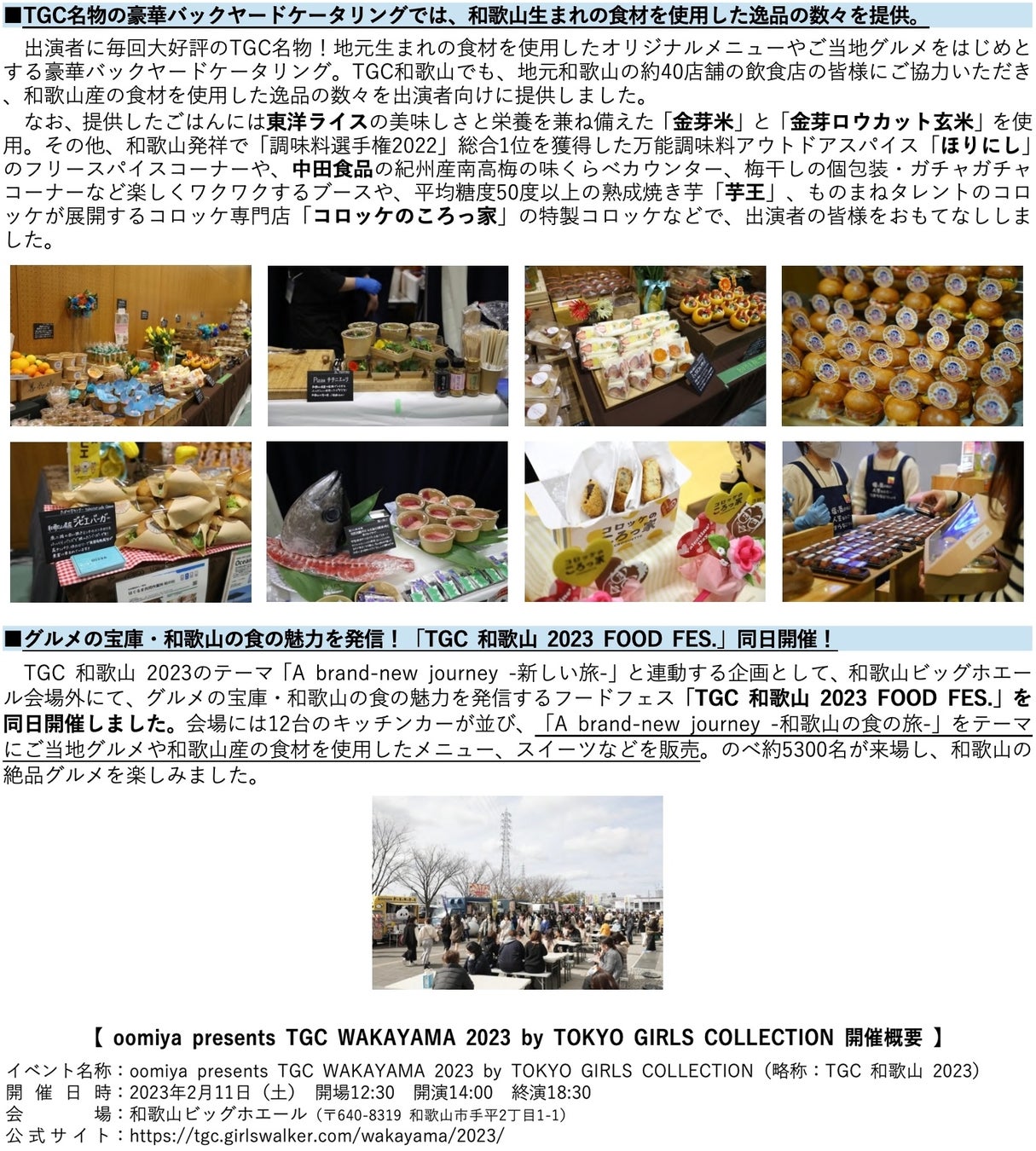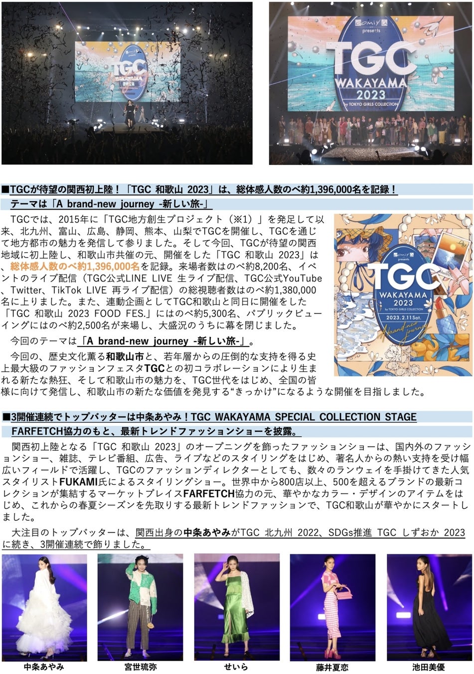 東京ガールズコレクション実行委員会(企画/制作:株式会社W TOKYO)は、2023年2月11日(土)に和歌山ビッグホエールにて、『oomiya presents TGC WAKAYAMA 2023 by TOKYO GIRLS COLLECTION(以下、TGC 和歌山 2023)』を開催。和歌山市共催の元、東京ガールズコレクション(TGC)が関西に初上陸しました。