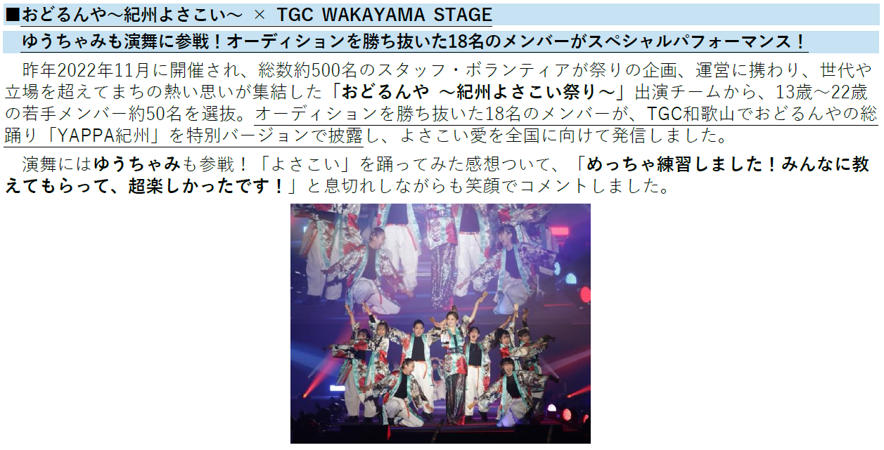 昨年2022年11月に開催され、総数約500名のスタッフ・ボランティアが祭りの企画、運営に携わり、世代や立場を超えてまちの熱い思いが集結した「おどるんや ~紀州よさこい祭り~」出演チームから、13歳〜22歳の若手メンバー約50名を選抜。オーディションを勝ち抜いた18名のメンバーが、TGC和歌山でおどるんやの総踊り「YAPPA紀州」を特別バージョンで披露し、よさこい愛を全国に向けて発信しました。
