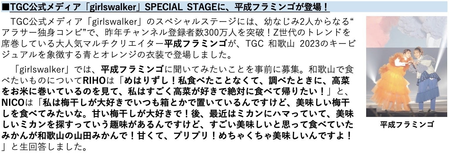総体感⼈数のべ約1,396,000 名を記録!クロちゃん・リチ カップルがサプライズ登場、TGC和歌⼭でイベント初共演!平原綾⾹、FANTASTICSらがアーティストライブで会場を盛り上げる。