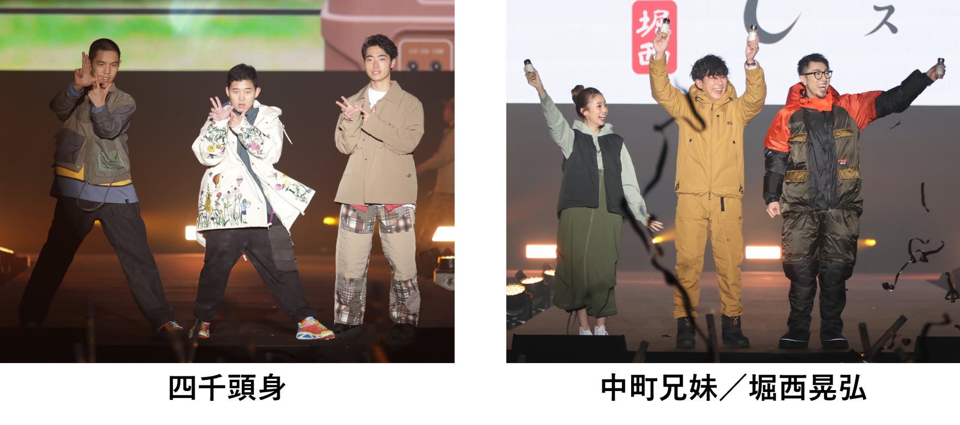 和歌山発祥で「調味料選手権2022」総合1位を獲得した万能調味料(アウトドアスパイスほりにし)のステージには、和歌山県のアウトドアセレクトショップ「Orange」取り扱いブランドのアイテムを使用したコーディネートで四千頭身をはじめとする人気モデル・ゲスト、さらに、開発者の堀西晃弘が中町兄妹とともに登場しました。