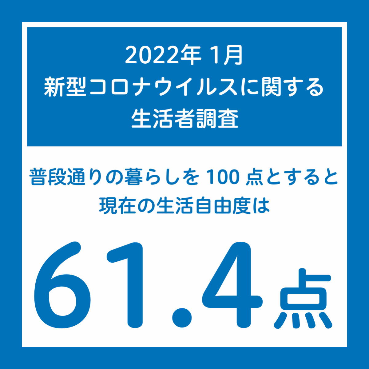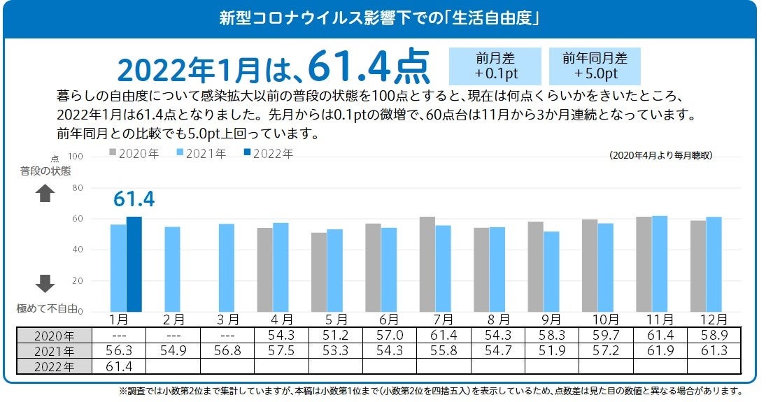| 1月の「生活自由度」は61.4点で、高い水準を維持。 感染者は増加傾向ながら、「不安」も「行動の抑制」もゆるむ |