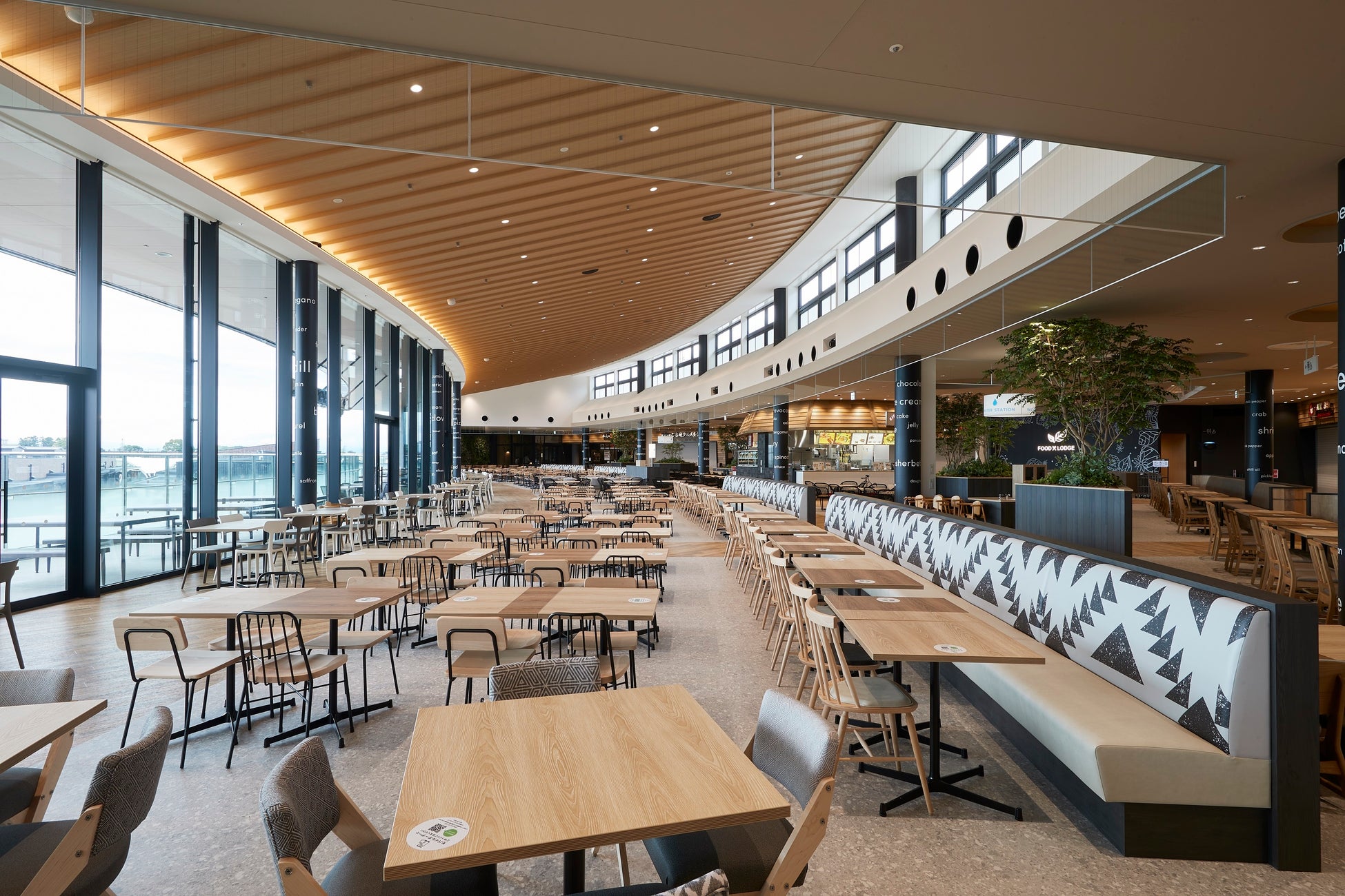 今回実証実験を行う「フードロッジ」は、多国籍な12店舗が出店し、ソファ席、親子席、電源コンセント付きカウンター席など多様なニーズに対応する約800席を備えています。日中は施設の広場を一望し、開放感のある約25m幅の窓には、日没からプロジェクションマッピングが投影され、幻想的な空間に様変わりします。現在は、深谷市の豊かな自然や花々をテーマとしたアートコンテンツと、イルカやクジラなどの海の生き物が泳ぎ回る臨場感たっぷりのコンテンツをご覧いただけます。