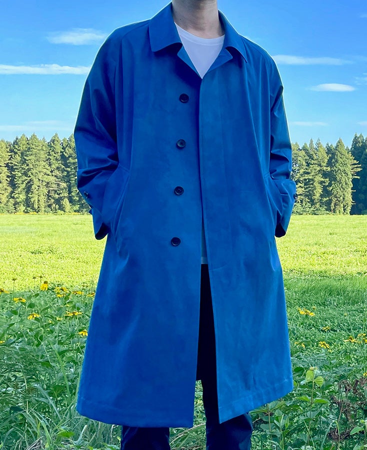 「本藍染コート」は、「あおもり藍産業協同組合」が手掛ける独自染色法をもつ地域ブランド「あおもり藍」と協業して製作した “洗練されたシルエットと美しい発色” が特徴のコートです。藍と天然由来の材料だけで染める“本藍染”の「あおもり藍」により手作業で染色した生地に、縫製からプレスまで各工程で最適な手仕事を施して仕上げる「サンヨーソーイング」コート専業50年の技術を駆使した、青森県でしか作れないコートです。