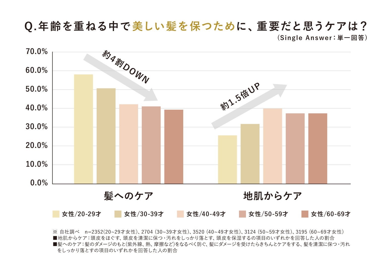 実際に、40-50代になると、表面的な髪のケアから、地肌ケアの必要性を感じる人が増加しています。国立社会保障・人口問題研究所「日本の将来推計人口(平成29年推計)」によると、2024年には日本の人口に占める世代別人口比率の50%以上が50歳以上となり、エイジングヘア[*3]に対する悩みを持つ方が増加することが予測されます。