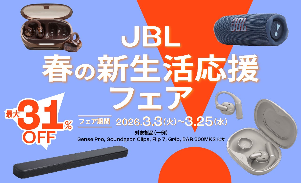 アメリカ カリフォルニア発祥の世界最大級のオーディオブランド「JBL」を擁するハーマンインターナショナル株式会社(本社:東京都千代田区、代表取締役:桑原拓磨)は、2026年3月3日(火)~3月25日(水)の期間限定で人気のワイヤレスイヤホンやポータブルスピーカー、サウンドバーを最大31%オフで購入できる「春の新生活応援フェア2026」を開催いたします。