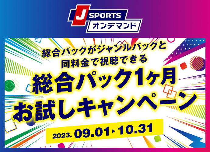 「J SPORTSオンデマンド 総合パック 1ヵ月お試しキャンペーン」は、 J SPORTSオンデマンドで配信しているすべてのジャンルパック**のコンテンツが視聴できる総合パック(¥2,640 税込)をジャンルパックの料金(¥1,980 税込) でお楽しみいただけるお得な期間限定キャンペーンです。