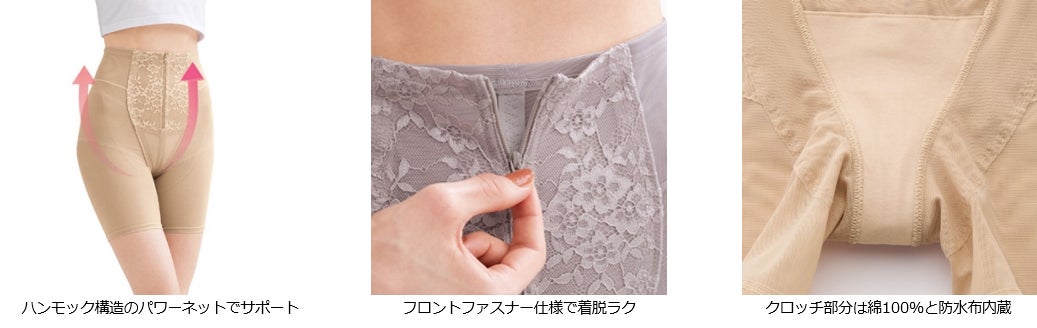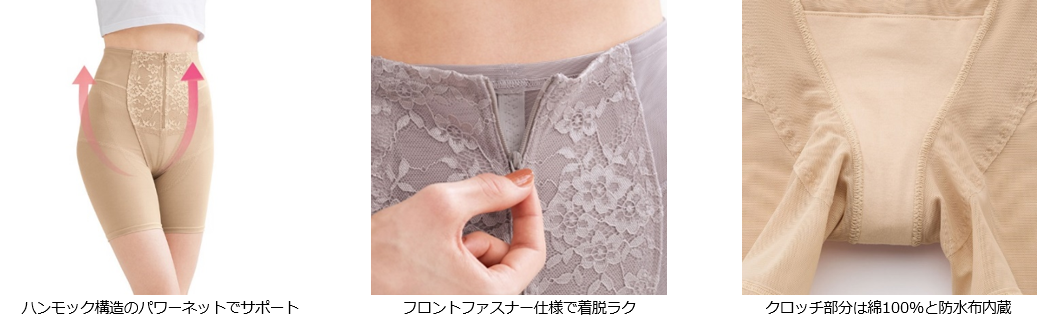 ガードルの特殊構造による骨盤底筋補助力で、骨盤内臓器を優しく持ち上げるように、サポートすることを手軽にアシストし、毎日を快適に!