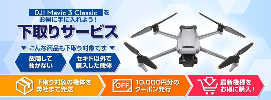 対象製品の下取りを行っていただいたお客様に、DJI Mavic 3 Classic を含む各製品の購入時にお使いいただける、10,000円分のクーポンを発行、または店頭購入時に10,000円をお値引きいたします。