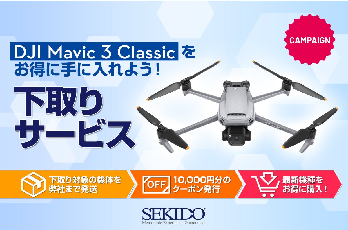 日本初のDJI正規販売代理店である株式会社セキド(本社:東京都港区、代表取締役:大下貴之)では、2023年2月6日(月)より、お持ちの不要なDJIドローンを下取りして、最新ドローン「DJI MAVIC 3 CLASSIC(ディージェーアイ マビック スリー クラシック)」を10,000円OFFで購入いただける「DJIドローン下取りサービス」を、セキドオンラインストアとDJI認定ストア 東京虎ノ門にて開始いたします。5.1K/50fps対応 4/3型センサーのHasselbladカメラ搭載で、圧倒的な空撮映像が撮影できる Mavic 3 Classic をお得にお求めいただけるキャンペーンの申し込み受付期間は、2023年3月13日(月)まで。対象のDJI製ドローンであれば、動かなくても壊れていても、セキド以外で購入されたものでも下取り対象となります。