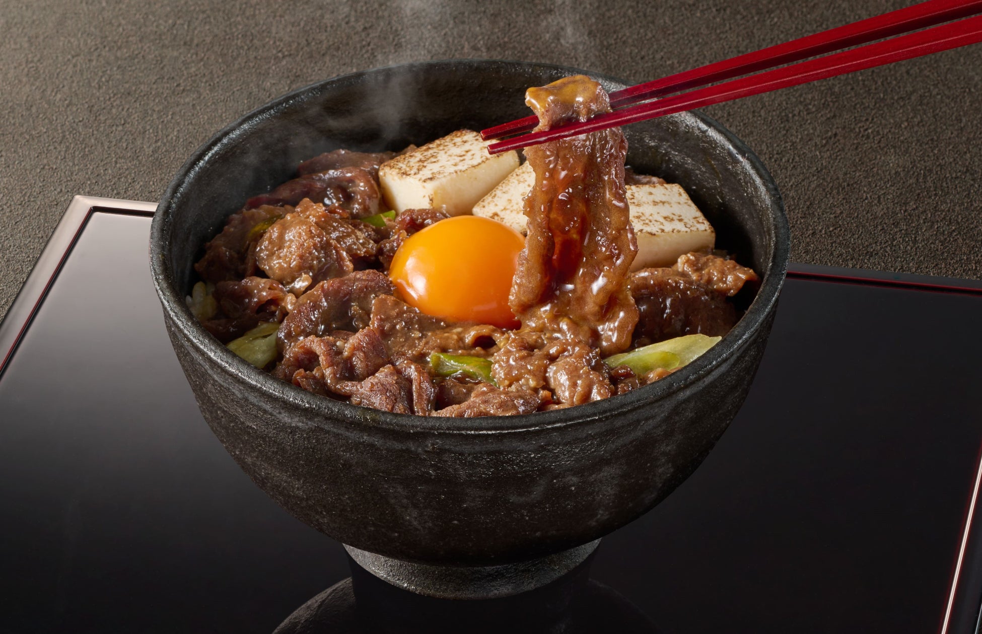 和三盆やうまみ成分が多く含まれる超特選の再仕込み醤油、利尻昆布エキスなど、素材にこだわって作った特製の割り下で、脂肪分の少ない牛肉を煮込んだ牛すき焼丼です。焼豆腐、ネギ、タマネギのほか、卵黄風ソースを添えました。