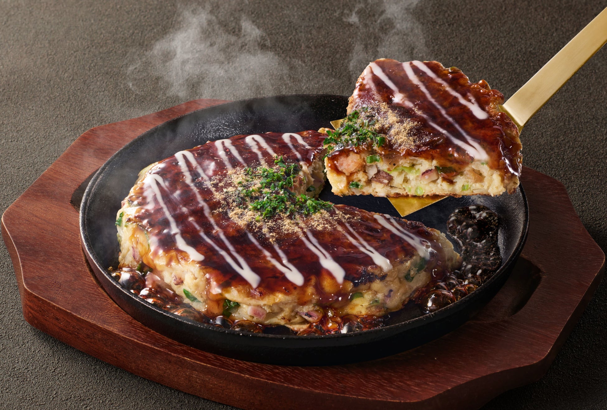 鰹出汁が香る生地に国産のキャベツとネギ、さらに5種類 (牛すじ、牛肉、こんにゃく、いか、えび) の具材を入れ、ふんわりと焼き上げたお好み焼です。ソース、マヨソース、削り粉、あおさ付き。