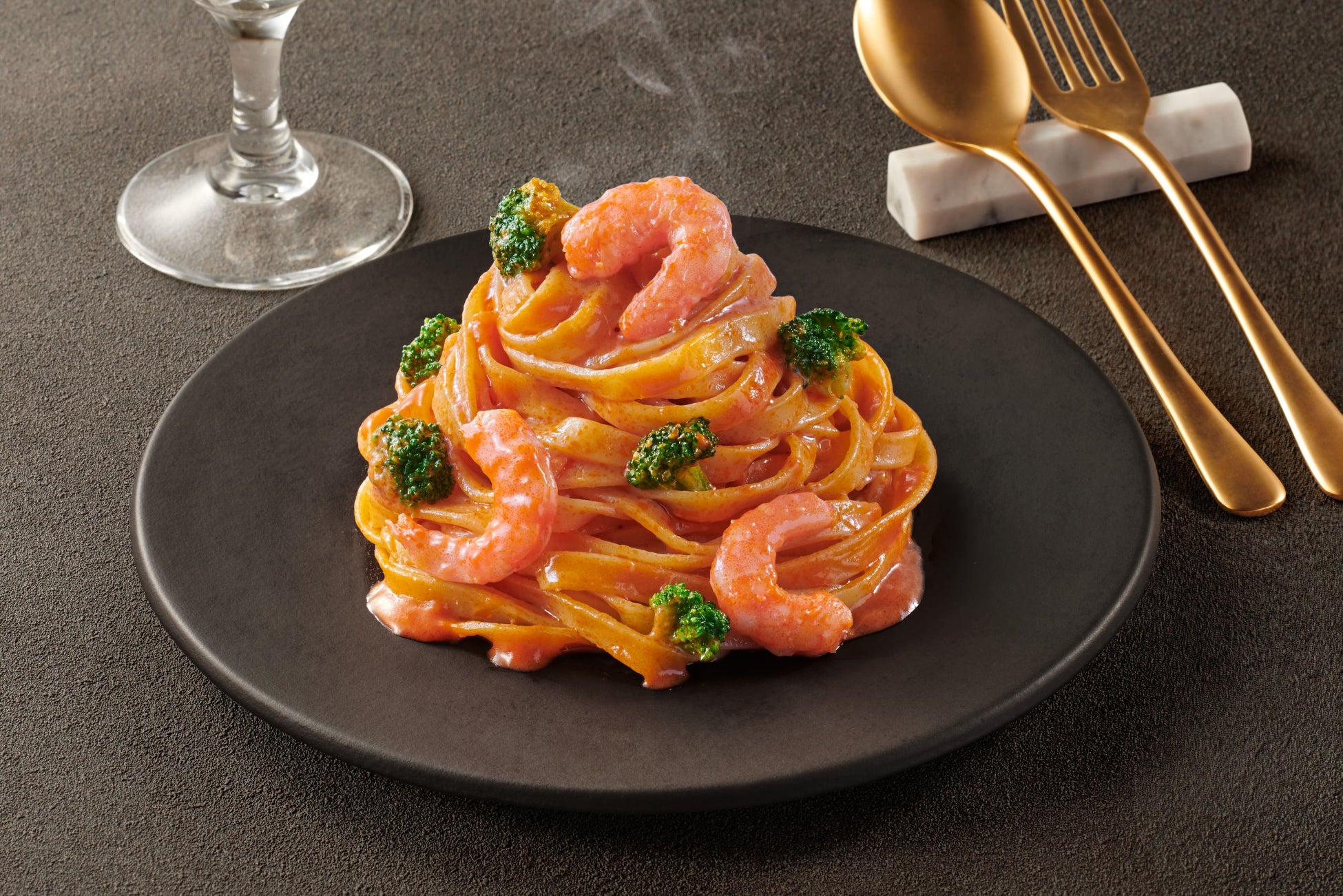 北海道産生クリームを使用し、オマールえびと完熟トマトのうまみをきかせた濃厚なソースと、もちもちとした平打ちの生パスタをあわせたパスタです。