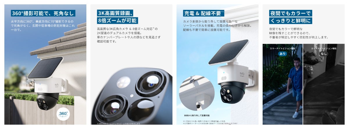 顔認識AI搭載の「Eufy eufyCam S330 2-Cam Kit」、360°追従して撮影可能な「Eufy SoloCam S340」を2024年10月3日(木)よりAnker Japan 公式オンラインストア等にて販売開始。どちらのモデルもソーラーパネルとバッテリーを搭載し、充電や配線が不要で簡単に自宅の警備や家族の見守りができます。
