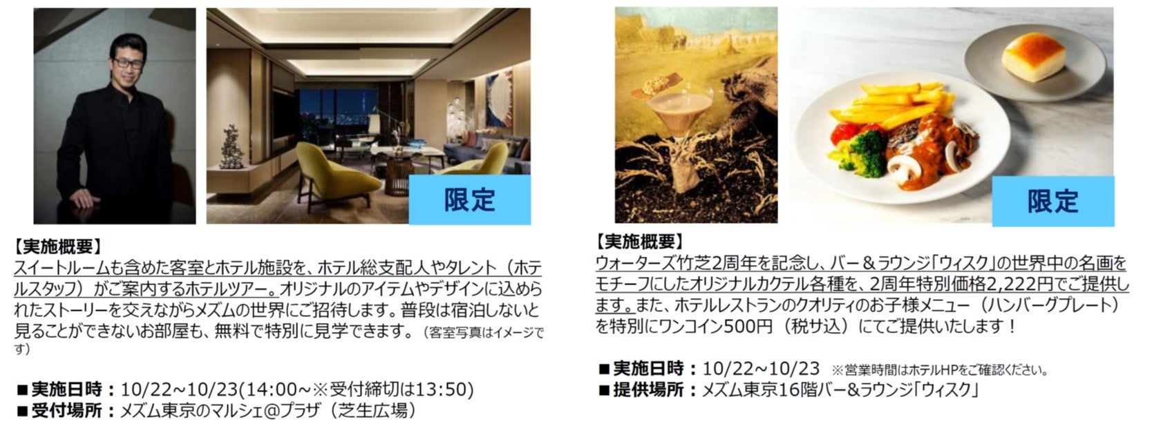 スイートルームを含むホテル館内を特別にツアーにてご見学いただけます。さらには、名画をテーマにしたカクテルを2周年特別価格でお試しいただけるほか、ワンコインお子様メニューも期間限定で登場し、メズム東京の世界観を家族みんなでお楽しみいただけます!