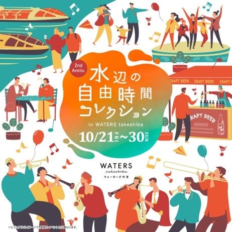 竹芝地区の浜離宮恩賜庭園が目の前に位置する、自然豊かなウォーターフロントが特徴の複合施設「WATERS takeshiba」。10月21日(金)から10月30日(日)まで「水辺の自由時間コレクション」を開催いたします。10月24日(月)には開業から2周年を迎え、ウォーターズ竹芝の各施設、ショップが感謝の気持ちを込めて、新しい文化や体験ができる時間を多様なコンテンツでお出迎えします。「竹芝干潟」を通して東京湾の環境問題を親子で学べるワークショップや、ウォーターズ竹芝内で育てたホップを使ったビールの第2弾「AO」の販売、各施設が腕を振るうマルシェなど、水辺で心地よく、観て・学べて・遊べて・食べて・出会える場所をご用意します。