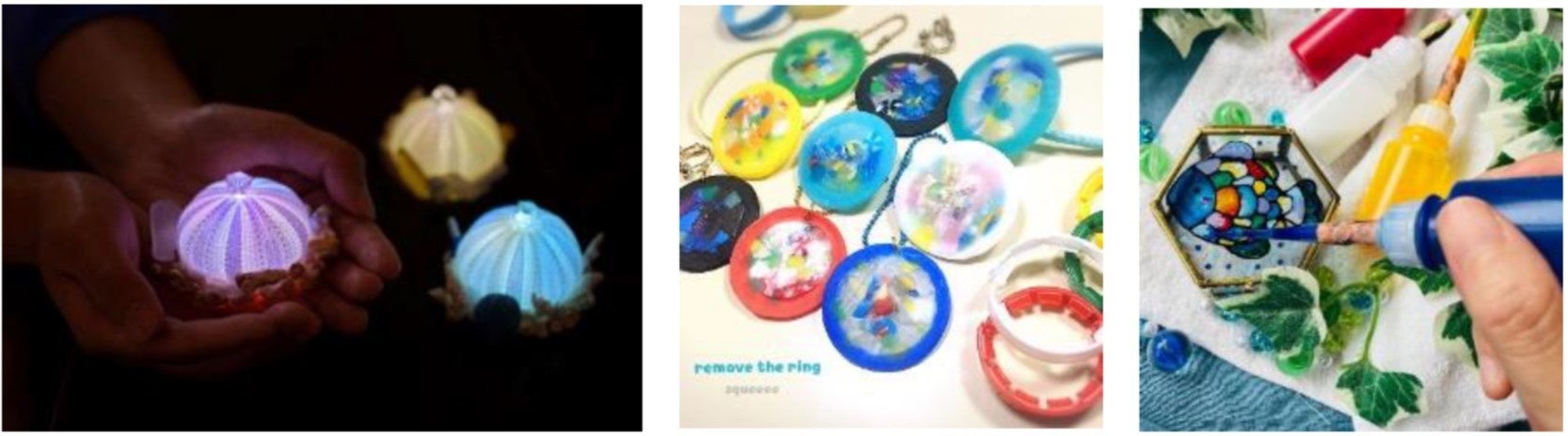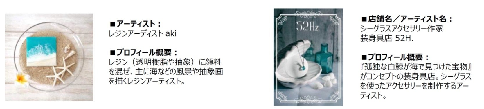 「海」や「SDGs」をテーマに活動をしている作家が大重合!海を抽象画で描いたレジンアートや、シーグラスを使用したアクセサリー、ペットボトルキャップやリングなどを使ったアクセサリーなどを販売するお店など、全部で3店舗が出店します。