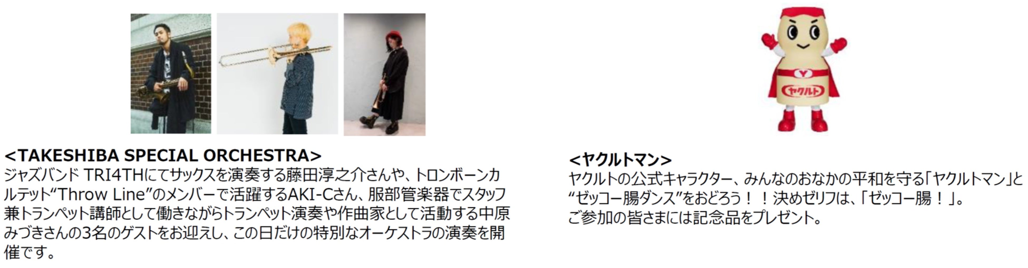 トランペットやトロンボーン、サックス奏者が登場したり、管楽器のカルテットもお楽しみいただけます。さらには、家族みんなで楽しめる大道芸や、ウォーターズ竹芝にオフィスを構える株式会社ヤクルト本社からは「ヤクルトマン」が登場!水辺で心地よく鑑賞できるイベントです。