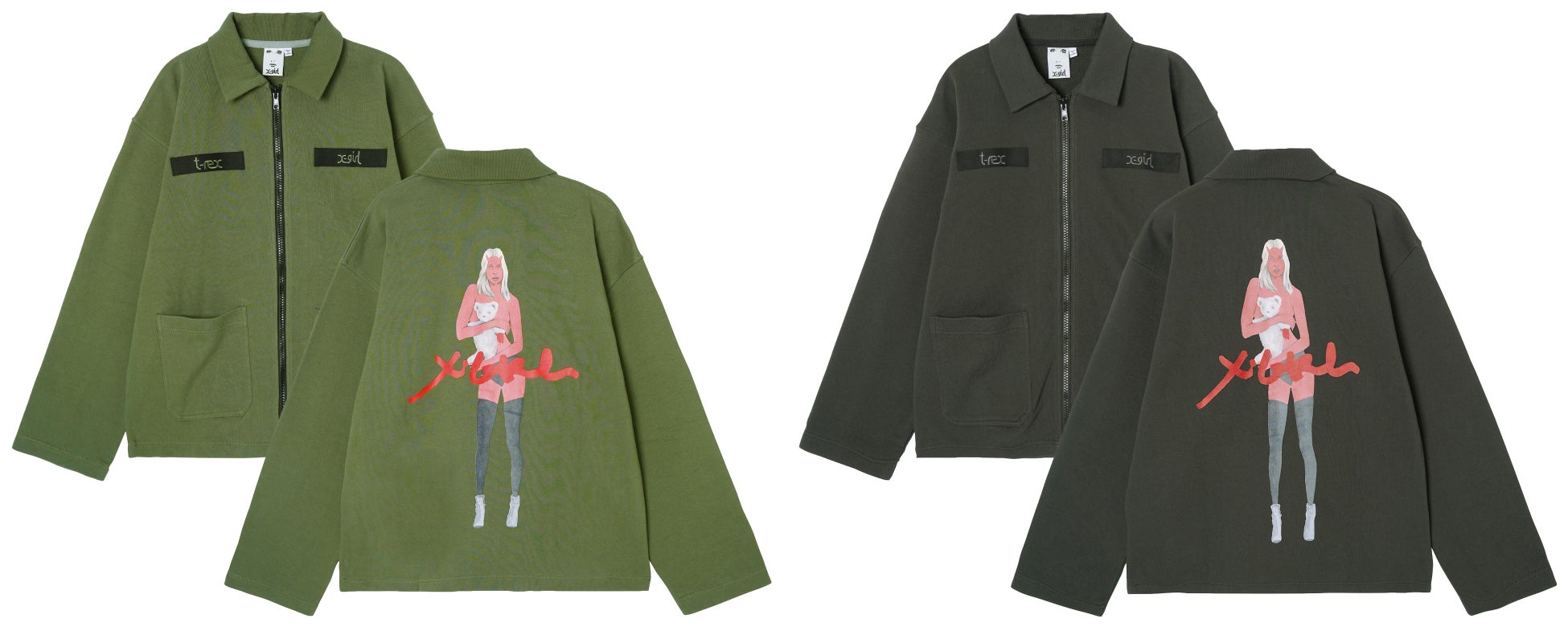 8歳から絵筆をとるT-Rexは、現実の体験とインターネットという仮想空間を着想源に若者をモチーフとした作品を好んで描いている。本コラボレーションアイテムには、T-Rexの象徴である赤く角の生えた独創的な女性画とX-girlロゴを組み合わせた描き下ろしのアートワークをプリント。セットアップで着用可能なジャケットとパンツ、サイズ展開が豊富なスウェットフーディーなど計6型を展開いたします。