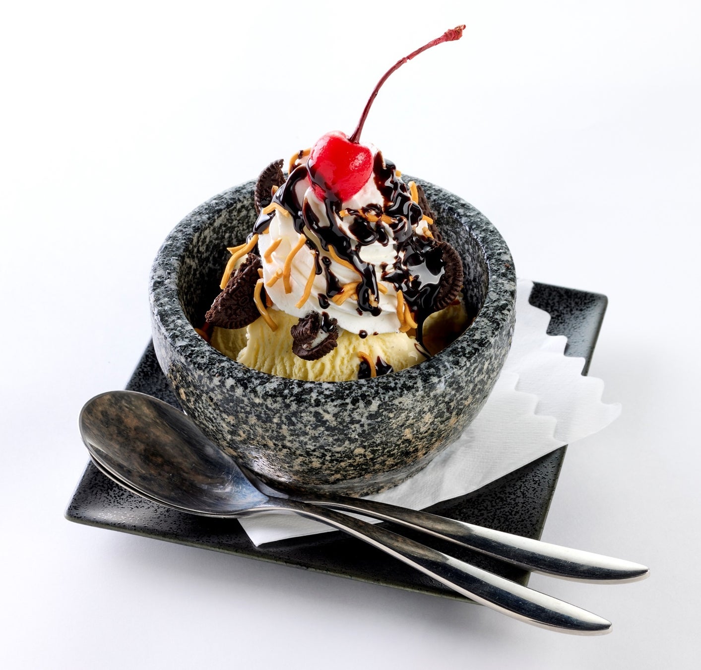 甘じょっぱさがたまらない!バニライアスの甘さとベビースターの塩味。凍らせた石鍋にベビースターを敷き、バニラアイスと生クリーム。スプーンでよく混ぜて召し上がれ。