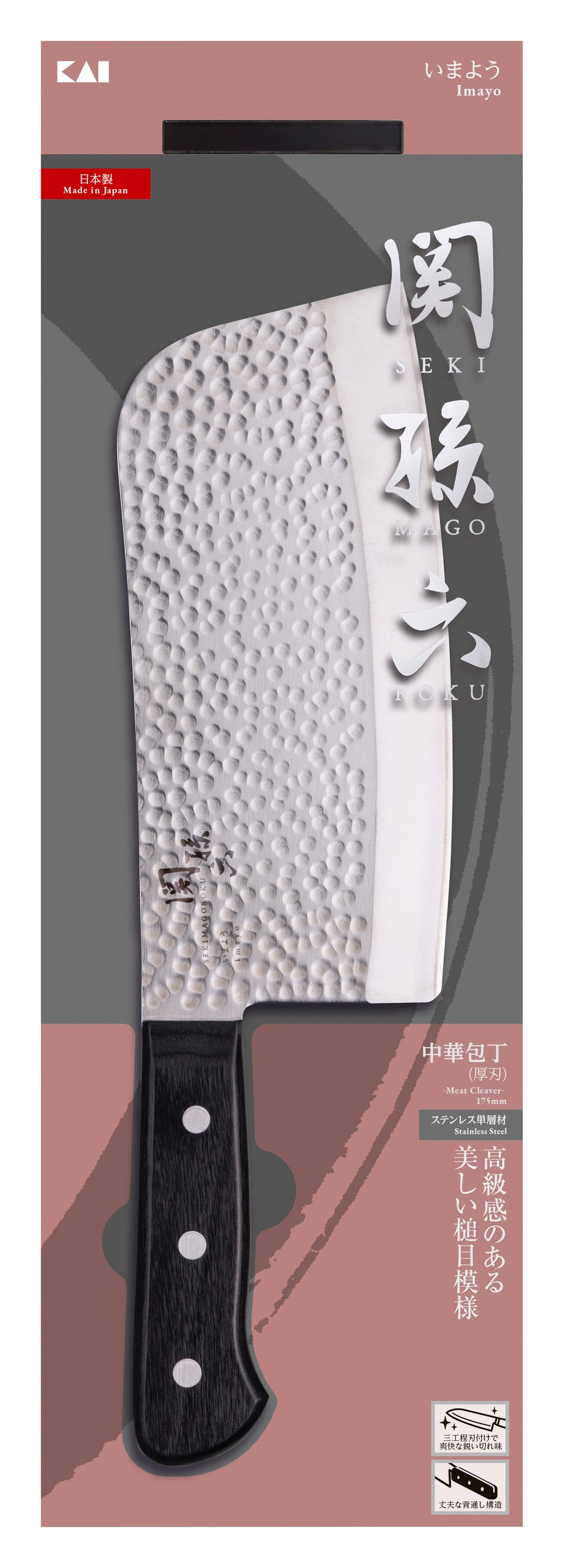高級感のある美しい槌目模様が特長の「いまよう」は、刃付け工程で、仕上がりがよりなめらかになるオリジナルの加工技術を採用したことで、食材への切り込みがよくなり、鋭い切れ味を実現しているシリーズです。今回新しく中華包丁2種がラインナップに加わります。