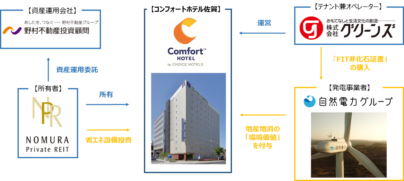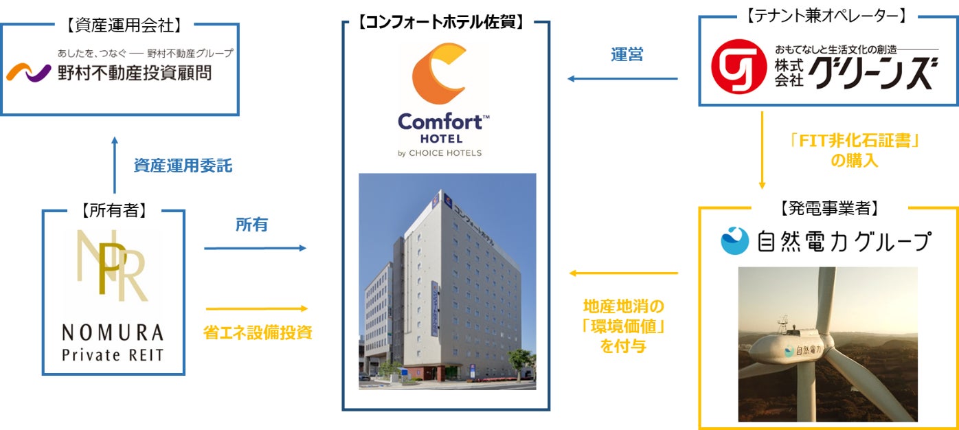 グリーンズは、「コンフォートホテル佐賀」において、自然電力株式会社(本社:福岡県福岡市/代表取締役:磯野謙、川戸健司、長谷川雅也、以下「自然電力」)より、同グループが共同保有する佐賀県唐津市の唐津市湊風力発電所由来の「FIT 非化石証書」を購入することで、2022 年度の電気使用に伴うCO₂排出量実質ゼロを実現いたしました。また、本投資法人においては、省エネに繋がる設備投資(空調機器の更新や全館LED 照明への切替)を行い、電気使用量(エネルギー使用量)の抑制を行いました。なお、「コンフォートホテル佐賀」では「FIT 非化石証書」の購入により、年間およそ135 トンのCO₂排出量の削減が図れる見込みです。