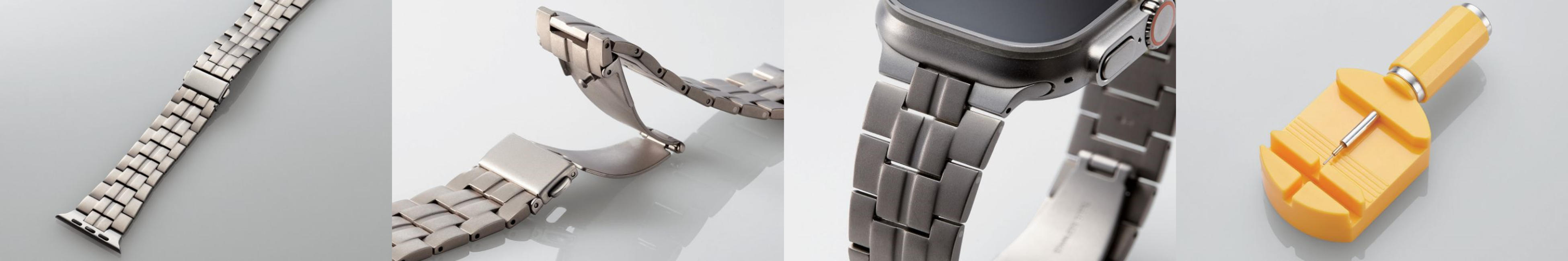 鋼鉄以上の強度と貴金属に匹敵する耐食性を持ちながら、鋼鉄の約55%の質量と言われているチタン素材をバンド本体のコマ部分に採用しました。3連タイプのコマのようですが、1つの塊(1連)になっているオリジナリティーあるデザインのバンドです。普段使いはもちろん、結婚式やパーティーなどのフォーマルシーンまで幅広く使えるエレガントなバンドです。チタンとステンレスの素材は水や汗に強く、長い年月で使用することができます。Apple Watch Ultra本体のカラーとマッチする、シルバーです。Apple Watchとバンドを接続するラグ部分は、外側からネジが見えず外れにくいオリジナル形状です。留め具は、バンド全体がつながった状態で折りたたんで装着する三つ折れプッシュ式です。外す際は側部のプッシュボタンを押して外します。バンドをApple Watchに装着したままで液晶画面の確認、本体の操作、各種ボタン操作、純正の磁気充電ケーブルへの設置が可能です。バンドの長さを調整するための調整工具付きです。