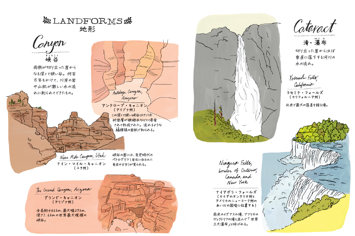 地形、天気、動物、植物、虫、魚などをイラストで紹介