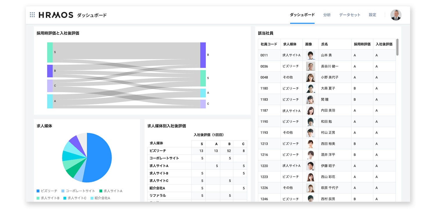 採用から入社後の活躍までの人事業務支援と従業員情報の一元化・可視化により、データに基づく人財活用を実現するサービスです。シリーズには、採用管理システム「HRMOS採用」や、従業員データベースを中心に、目標・評価管理、1on1支援、組織診断サーベイなどの機能を提供している人財活用システム「HRMOSタレントマネジメント」があります。その他にも、勤怠管理システム「HRMOS勤怠」や経費精算システム「HRMOS経費」を提供しており、企業の人事は「HRMOS」シリーズの活用により従業員一人一人の多面的なデータを可視化し、人財活用へ生かすことができます。