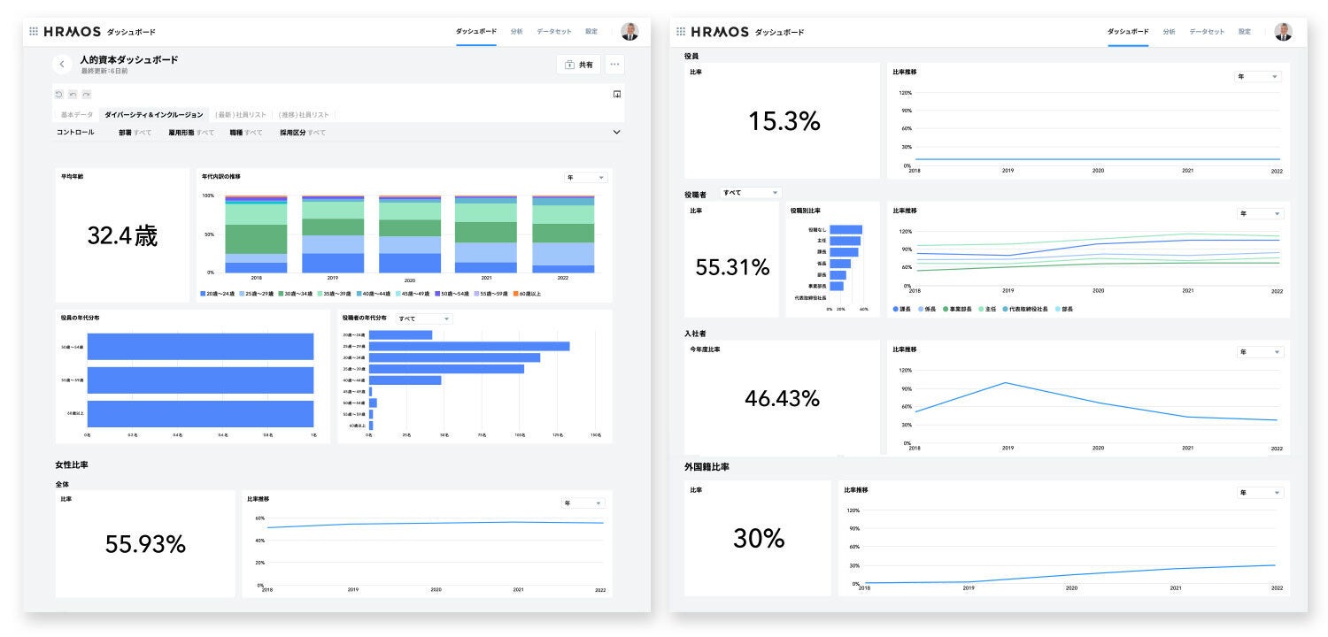 人的資本ダッシュボード | ・年齢/性別/職種/等級/役職等の比率 ・ダイバーシティ&インクルージョン (女性活躍・多様性の割合・育休取得数など) |