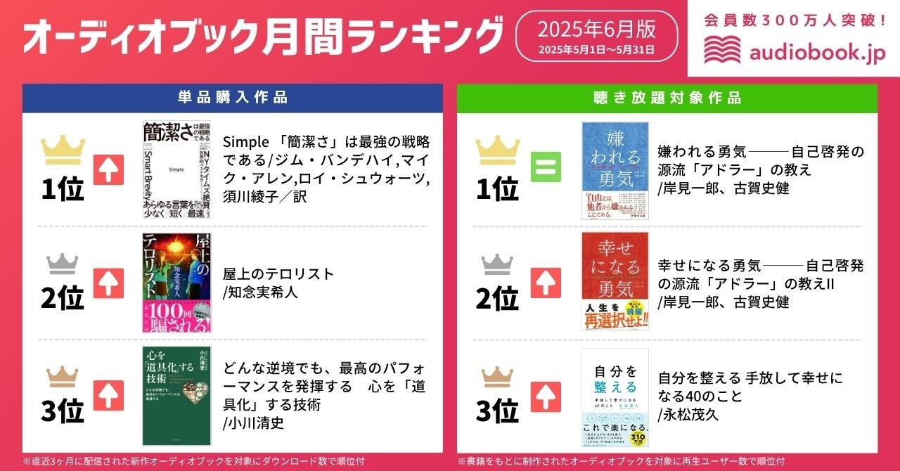 株式会社オトバンク( 本社:東京都文京区、代表取締役社長:久保田裕也、以下「オトバンク」)は、当社が運営する会員数300万人超、オーディオブック書籍ラインナップ数No.1(※1)のオーディオブック配信サービス「audiobook.jp」における、オーディオブック月間ランキング6月付(2025/5/1~5/31)を発表します。