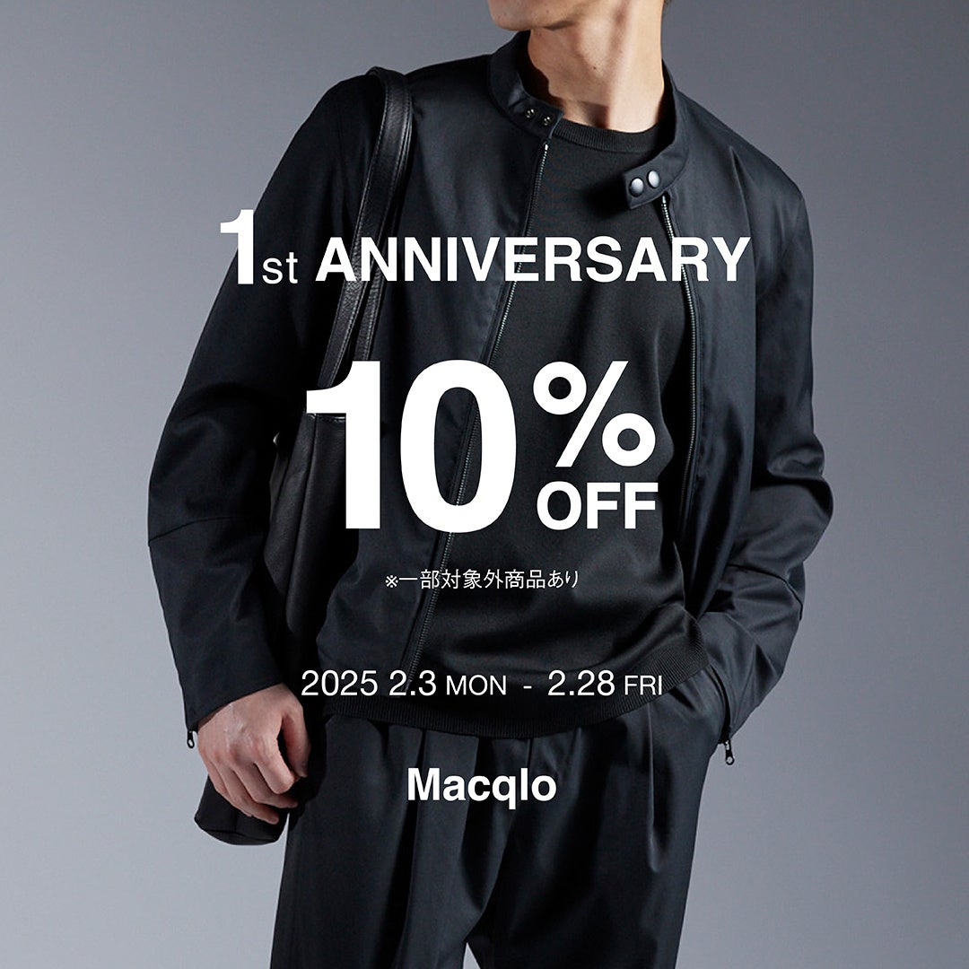 この度、2月3日(月)11:00から2月28日(金)の間、「Macqlo 1st ANNIVERSARY」を開催します。Macqloの公式オンラインストア・公式ショップにてMacqloのアイテムが全品10%OFF(※一部商品除く)でお買い求めいただけます。