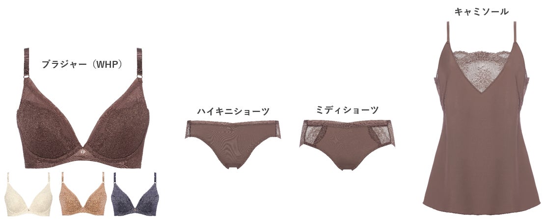 繊細なレースを贅沢に使いながらも、シンプルかつ上品なデザイン。ひと雨ごとに深く色づくアジサイの花の魅力的な美しさを、ストレッチリバーレースで表現した人気シリーズに、新色のブラウンとクリームが登場します。