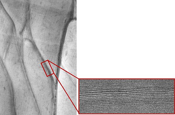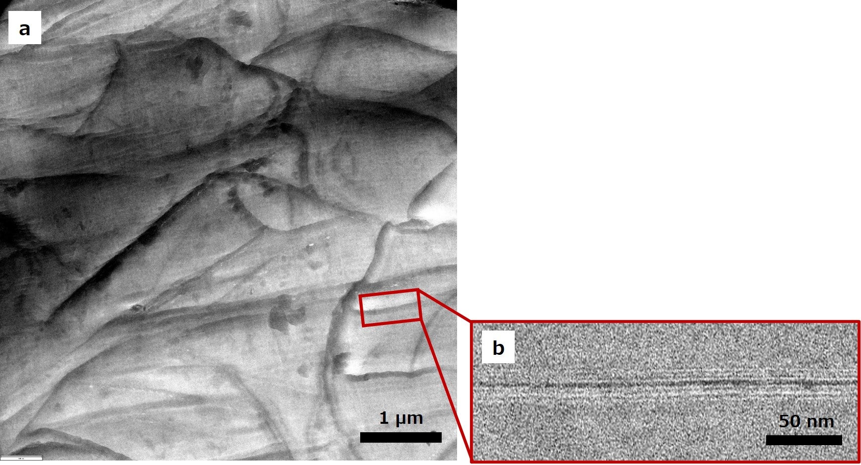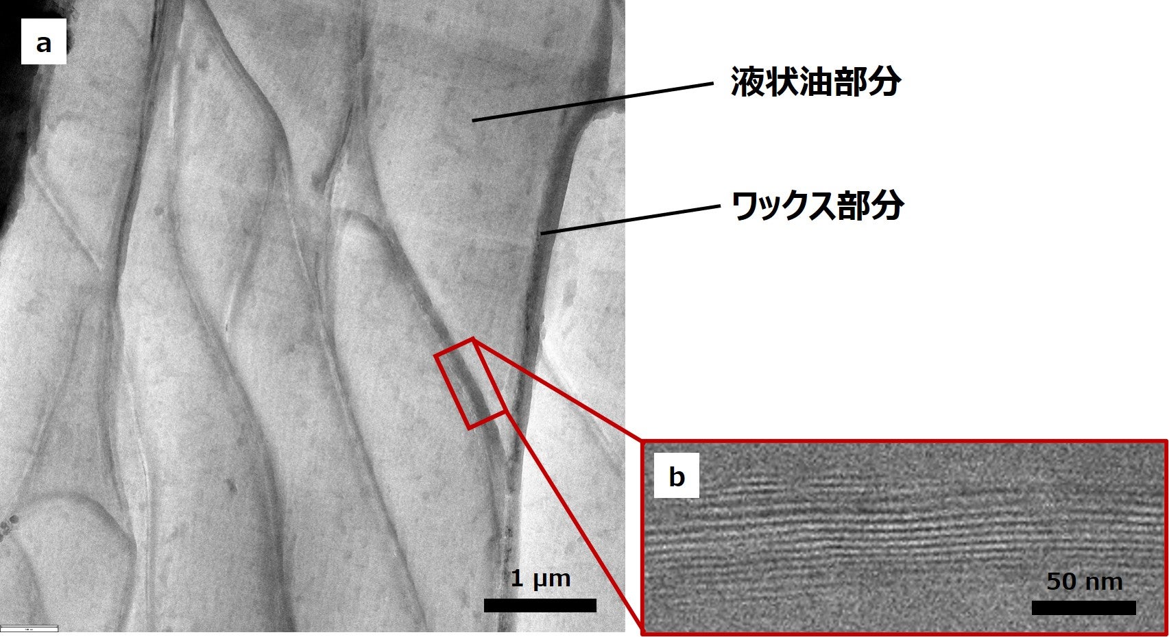 図1 クライオ電子顕微鏡による口紅本来の構造(a)とその拡大像(b)