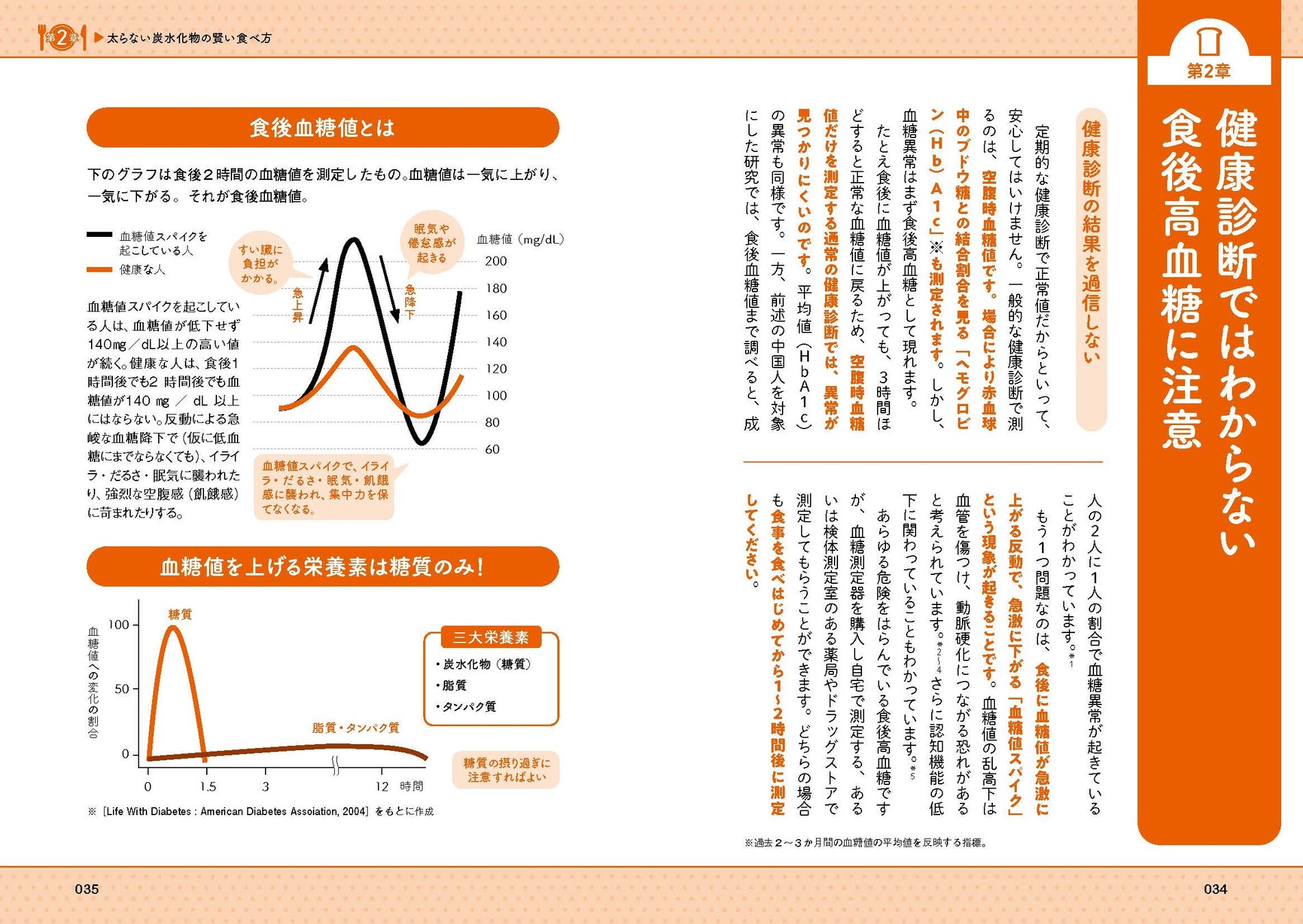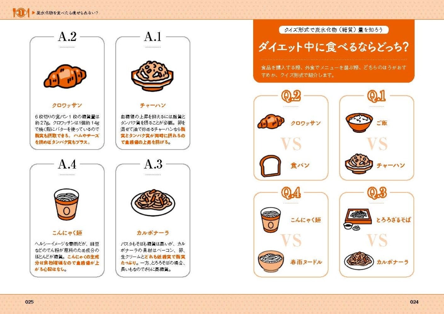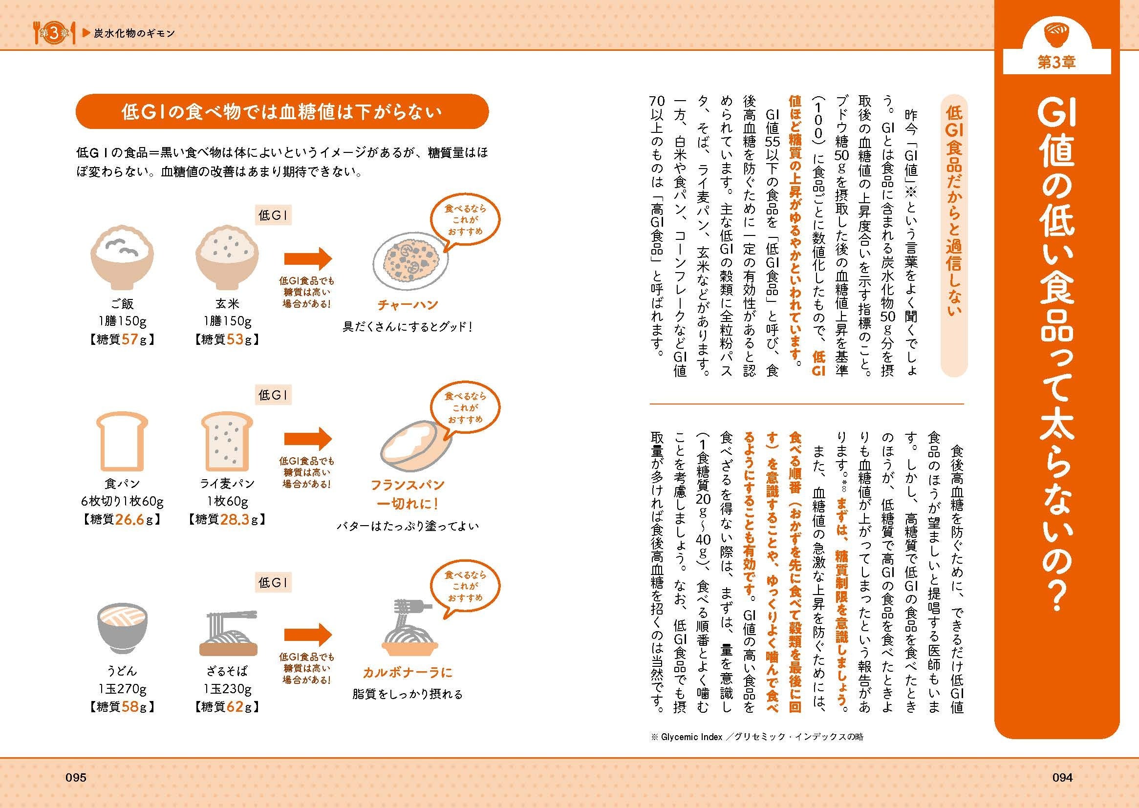 炭水化物を食べながらでも血糖値を上げない食事法を具体的に紹介し、「GI値の低い食品って太りにくいの?」「外食のときはどうすればいい?」「食べ過ぎてしまったら翌日は食事を抜くべき?」といったギモンにも医学的に回答。さらに「白米よりチャーハンのほうが太らない」「油はたくさん摂ってOK」「朝のフルーツはNG」など、今までの固定概念を覆す新常識も。