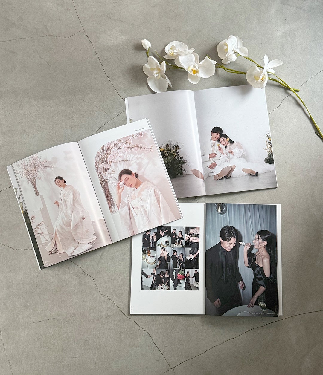 実際に着用できるドレスや専属ヘアメイクスタッフのメイク技術、背景やライティング、そして、デザインに頼らず写真を生かすレイアウトに至るまで、大切な節目の姿を残していただくためのaimのこだわりが見える1冊です。
