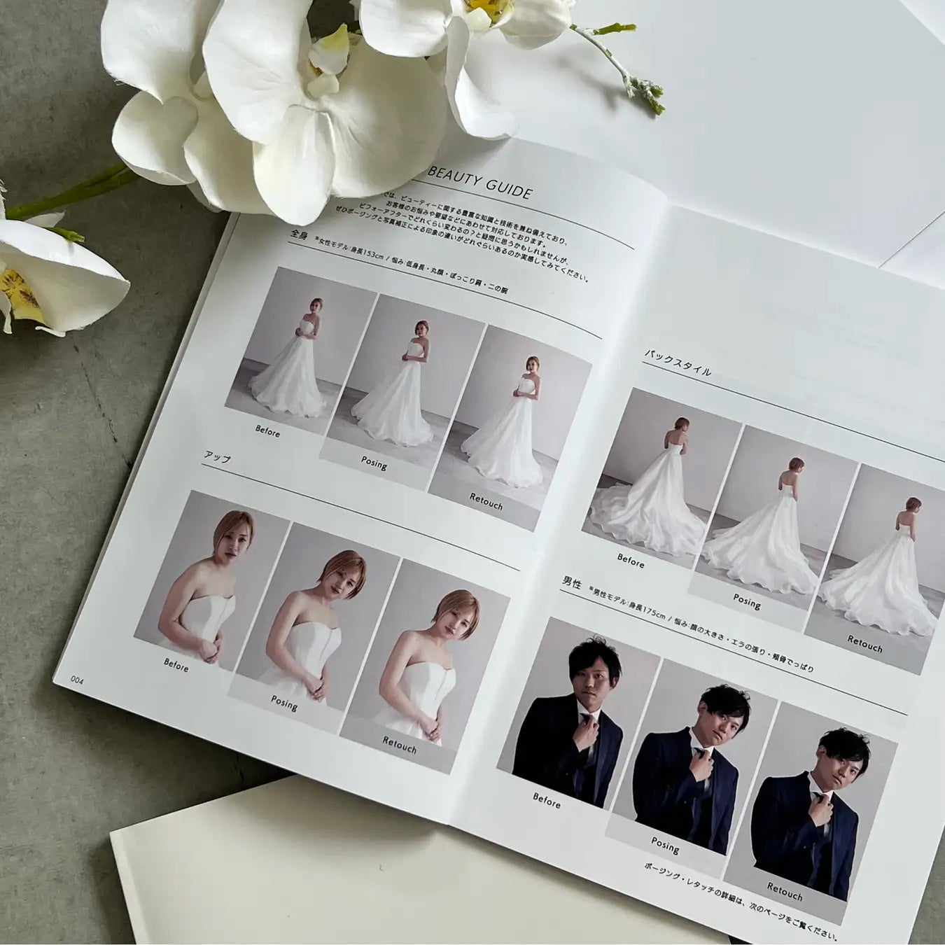 もう一方のアテンドブックの一番の見どころは「ビューティーガイド」。「魅力を最大限に引き出す」ことを第一に置いているaimフォトグラファーとデザイナーが誇る、撮影技術とレタッチ見本を紹介したものです。
