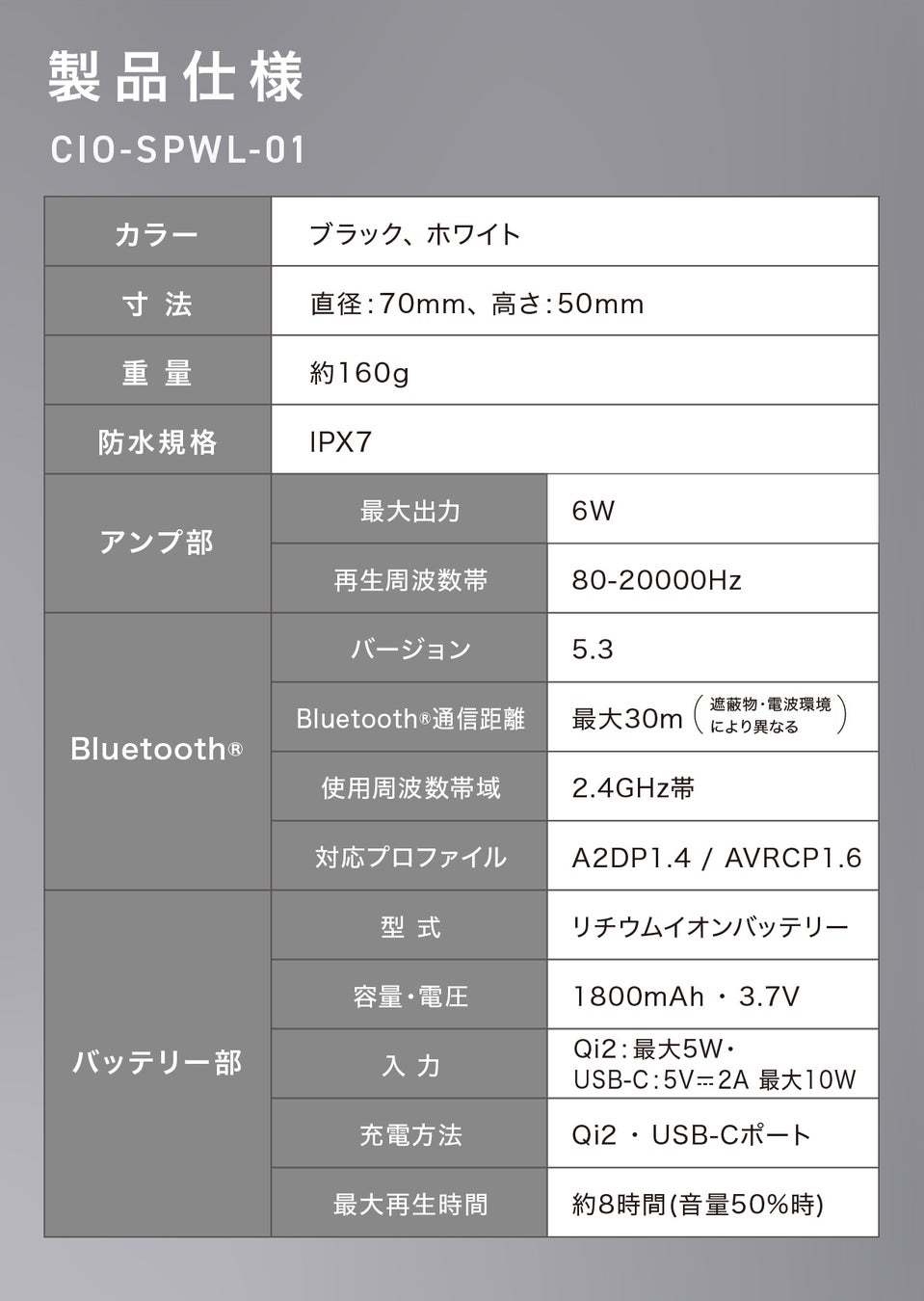 商品の特徴は、マグネット吸着・Qi2充電対応・防水規格IPX7・Bluetooth5.3・8時間連続再生・2台同時ペアリング・USB-C ×1となっています。