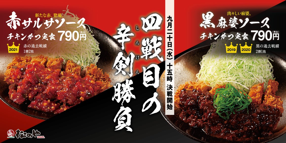 【松のや】チキンかつが2種のソースで一騎打ち「赤サルサソース」「黒麻婆ソース」新発売!