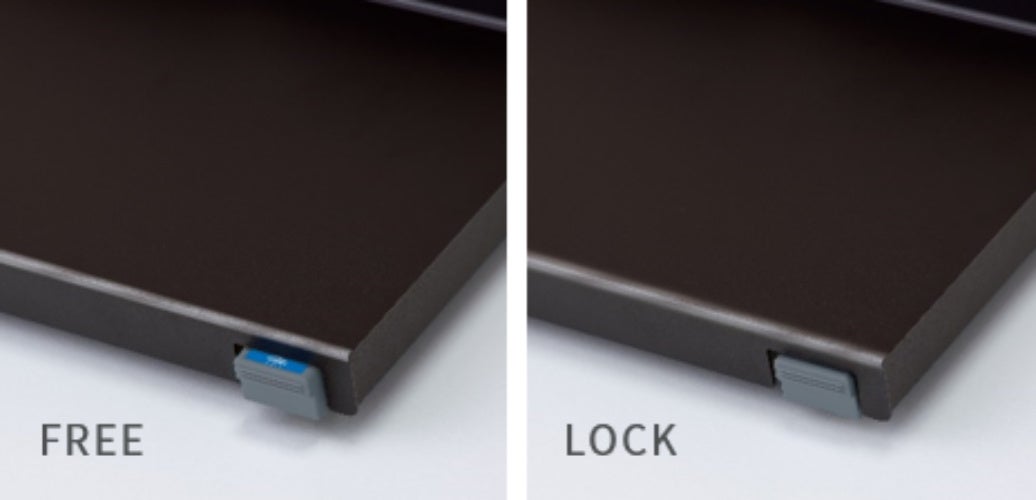 パネルの脚にはキャスターが付いており、柔軟にレイアウトが可能です。キャスターロックは、スイッチを前から押す操作でフリーとロックを簡単に切り替えできます。90度にレイアウトしても脚同士が干渉せず、パネルを隙間なく配置できます。