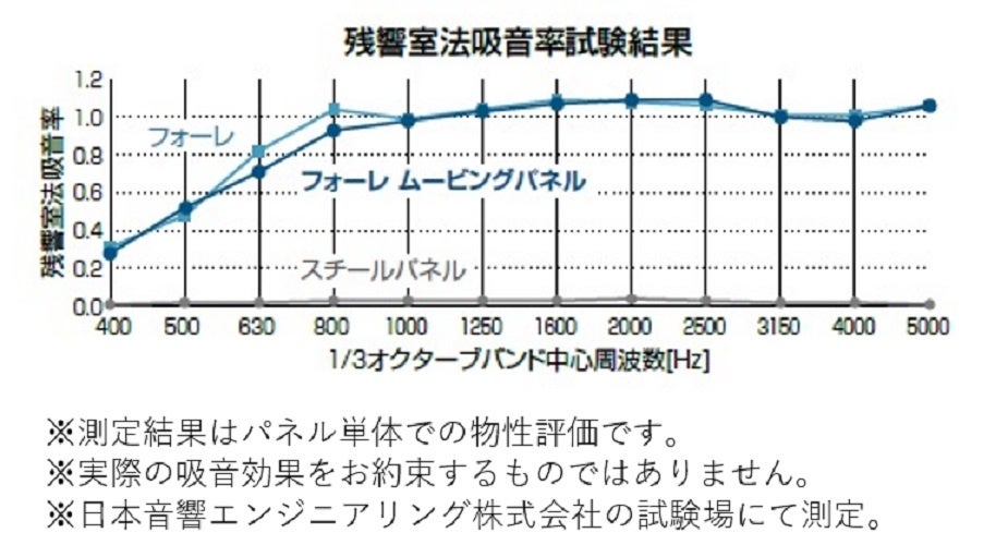 人の声に多く含まれる周波数帯域(500~1000Hz)の吸音率が0.52~0.98と高水準で、高い吸音性能を有しています。また、吸音・遮音効果によって、パネルの反対側へ伝わる音圧を軽減します。