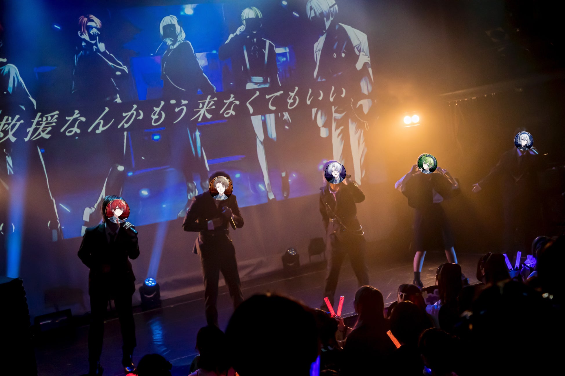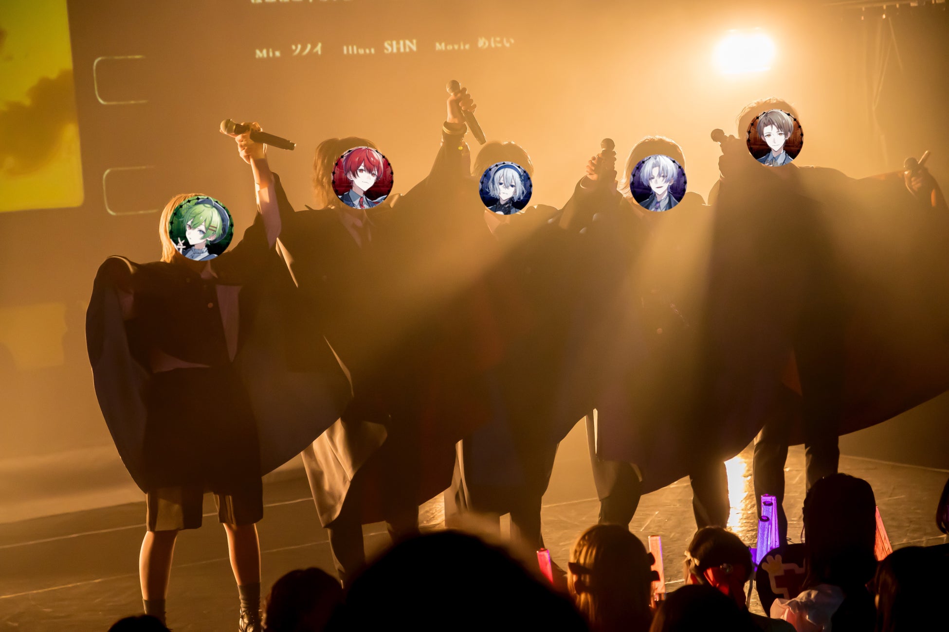 昼の部もいよいよ終盤。英語交じりの掛け合いが魅力な「CR詠ZY」(梅とら)では、改めて5人のチームワークの良さを表現しました。最後に選んだのはゼノレコが歌ってみた動画で最初に投稿した「プロトディスコ」(ぬゆり)。1年前に始まりを告げた同曲は、メンバーにとっても、リスナーにとっても思い出深いもの。ステージ背景に流れるMVと、いまステージ上で歌うメンバーの姿が重なり合い、歌唱後にはここまでで一番の歓声が沸き起こりました。