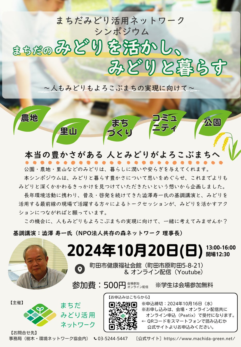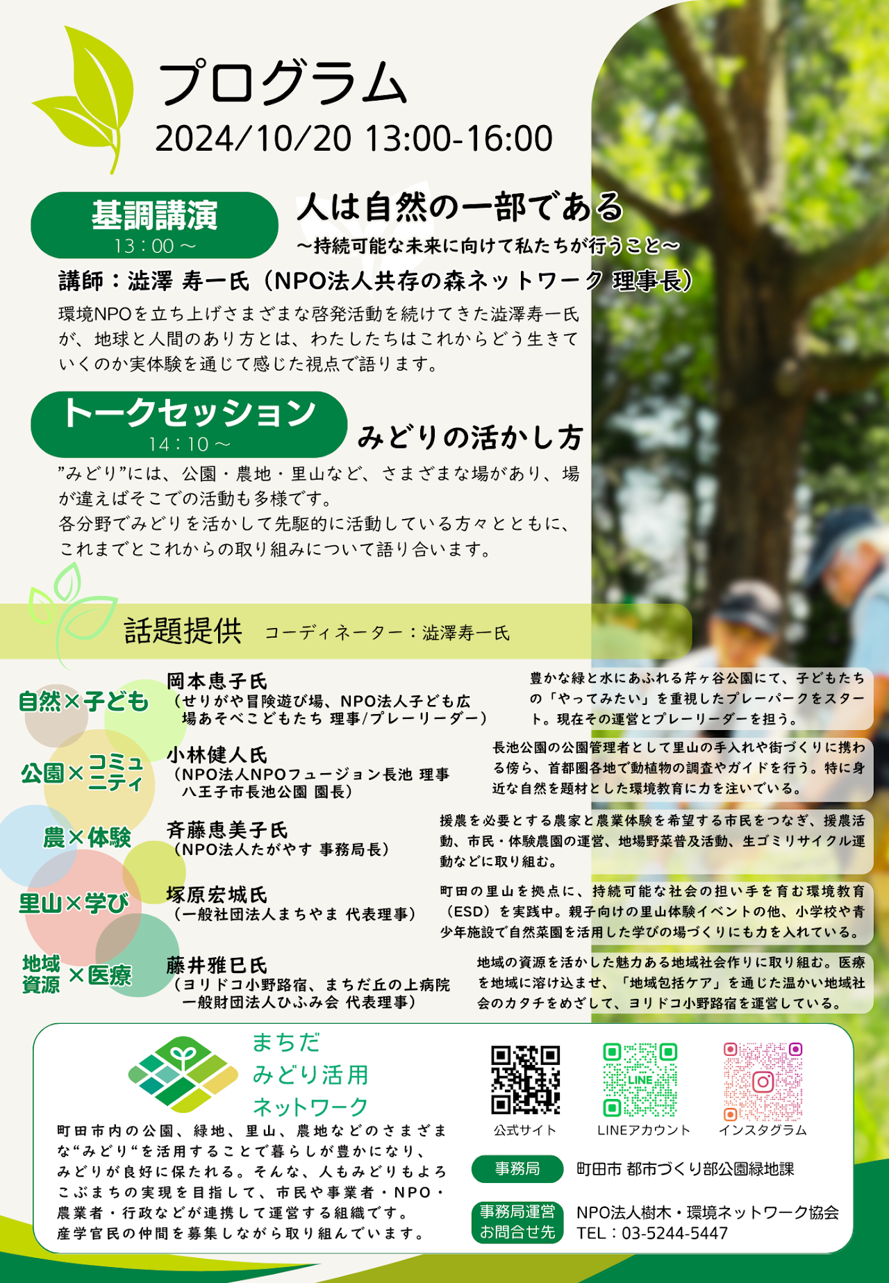 この度、多くの市民や団体、事業者の方に、みどりと暮らす豊かさについて思いをめぐらせ、これまでよりもみどりと深く関わるきっかけを見つけていただくため、「まちだみどり活用ネットワーク」主催によるシンポジウムを開催します。